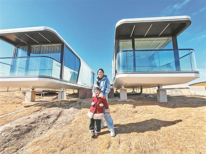 今年28岁的周姆是黑马河镇加隆村村民,她家后院有两个太空舱,两个集装箱住所,盛夏时节一房难求。“2023年,我们投资40多万买下两个太空舱。”周姆以前在青海湖边经营家庭旅馆,现在搬到自家草场做民宿,收入比以前好。
