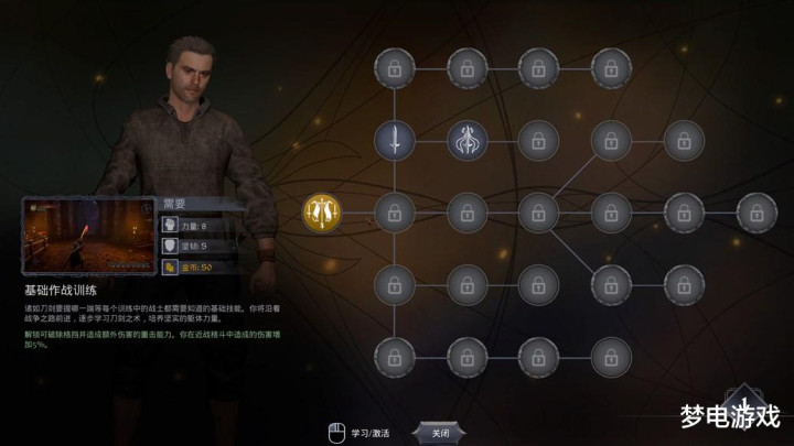 本作每升一级会获得三个属性点和一个技能点,学习技能要找专门的npc花钱学习,主要的技能有铁匠、生存、战斗三个大类。