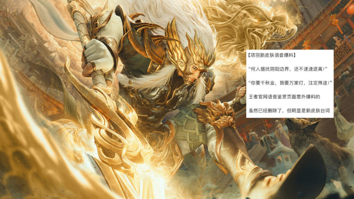 毕竟现有的两款引尘寰皮肤可都是以传说进行的,项羽那款自然不会例外,再按照后羿千劫归真和曹操万灵伏威的上线间隔来看,项羽的传说也就是会在明年出现,而项羽会有这款皮肤的原因则是跟前不久官方对他上线了跟这个系列皮肤直接相关的互动语音有关。