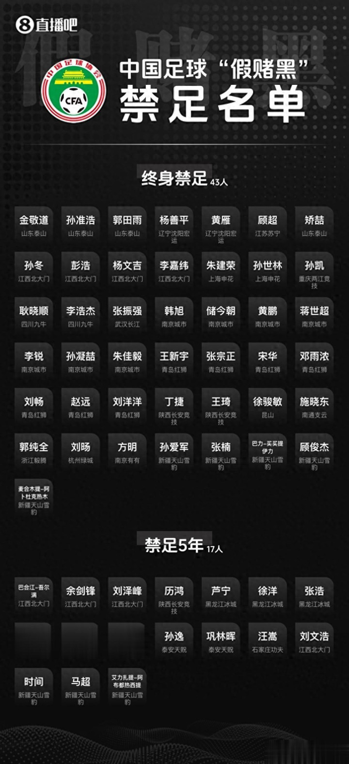 此前,足球职业联赛 “假赌黑” 专项整治已进行过一轮集中处理,2024 年 9 月 10 日的发布会上,足协曾公布处罚名单,60 人遭到行业禁入,其中金敬道、孙准浩等 43 人被终身禁止从事足球相关活动,汪嵩等 17 人则被禁足 5 年,处罚力度引发广泛震动。