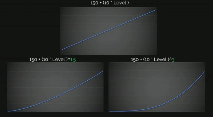 关于成长曲线,我总是用非常简单的公式:基础值+(等级*增量)^系数。它易于修改和可视化,幂次的系数为0时是线性增长,越高则曲线越陡峭。