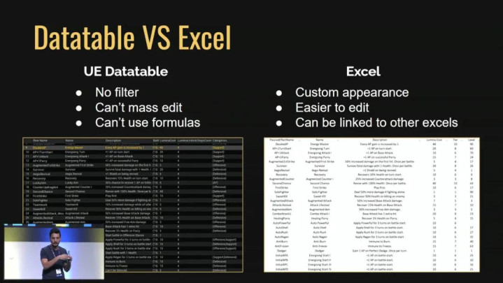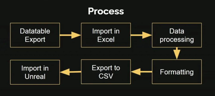 我们使用Excel的流程非常原始:从虚幻引擎导出数据表,在Excel中导入CSV文件、处理数据、重新格式化后再导回引擎。