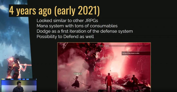 让我们回到4年前,看看游戏最初的样子。它看起来与我们今天的游戏非常相似。我们最初设计的是一款经典的3D JRPG,有法力系统和上百种消耗道具。我们只是增加了一个闪避系统,你可以在关键时刻按下按钮来躲避攻击。