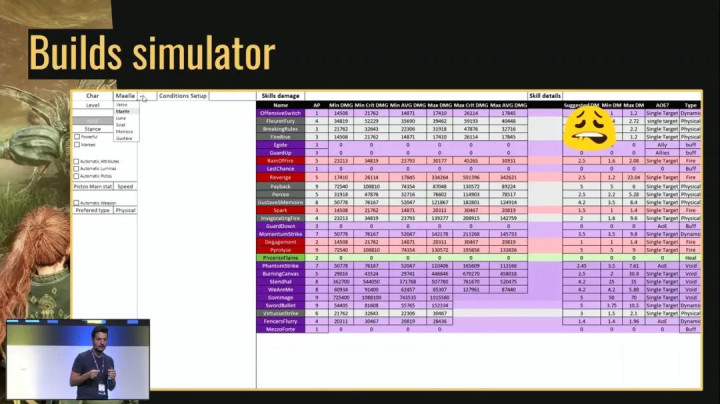 下图是我之前说的“构筑模拟器”。你可以给角色配上特定的装备和增益,实时查看每个技能造成的伤害。这让你可以在不打开引擎的情况下,测试游戏中的所有东西。