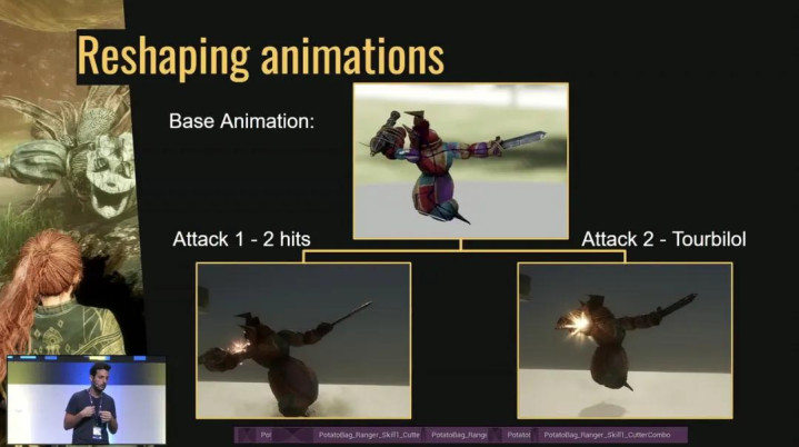 下面是一个动画修改的例子。左侧是我们最初的动画,测试后发现,它对玩家来说太难预判和格挡。于是,我们调整、剪辑,用不同的方式混合它,做了两个版本:一个只有两段攻击,用于普通敌人;另一个段数更多,用于游戏终局。理想情况下,这些修改应由动画师重新制作,但时间不允许,最后这个版本就直接用在游戏里了。
