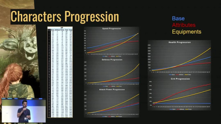 这是我们所有属性的曲线。蓝色的是基础属性,红色的是属性点,黄色的是装备。我们的思路是,在低等级时,属性点收益远比装备收益更强;而在高等级时,这又会反过来。因为在低等级,玩家的选择主要体现在分配属性;在高等级,玩家的选择则更多体现在装备搭配上。