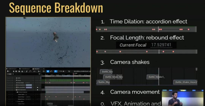 游戏中的每一次攻击都是一个独立的Sequencer。这意味着它们大部分,是由设计师手工制作的,包括镜头移动、震动、慢动作等变化。这是一个非常强大的工具,让我们能快速测试大量方案。