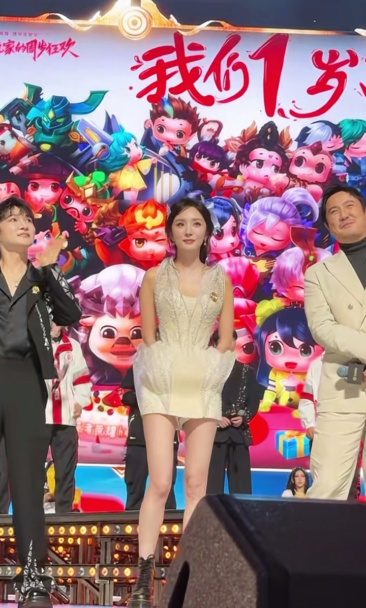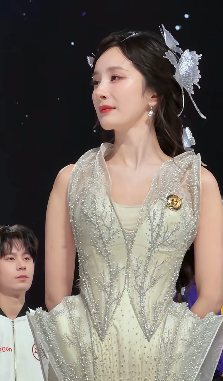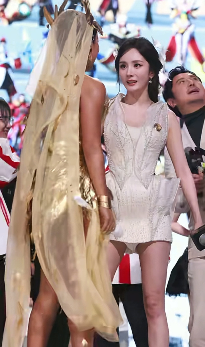 她像是舞台上是气场全开的“精灵射手”,候场时蹦跳捡彩带、比心互动的反差萌。再加上与沈腾互动的松弛感,让这套造型既有高定的高级感,又有角色的灵动感,更有真实的可爱感。妥妥的造型、状态、情怀三重封神,杨幂不愧是内娱跨界时尚的顶流标杆。