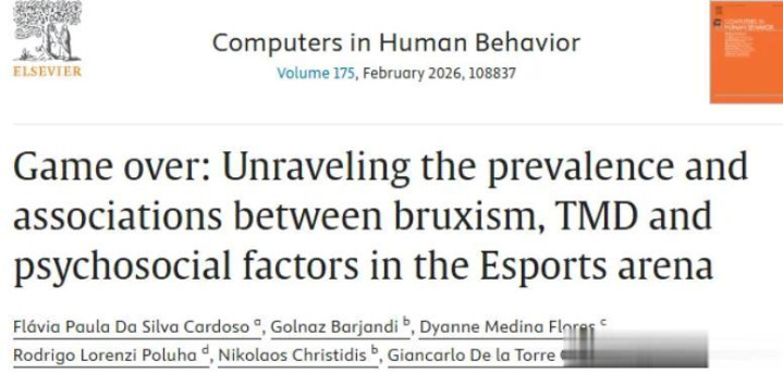 近期发表于《Computers in Human Behavior》的研究《游戏终结:揭示磨牙症、颞下颌关节紊乱与电竞领域社会心理因素之间的流行及关联》,首次对电竞人群中的磨牙症与颞下颌关节紊乱(TMD)进行系统调查,揭示电竞背后的“隐形伤害”。