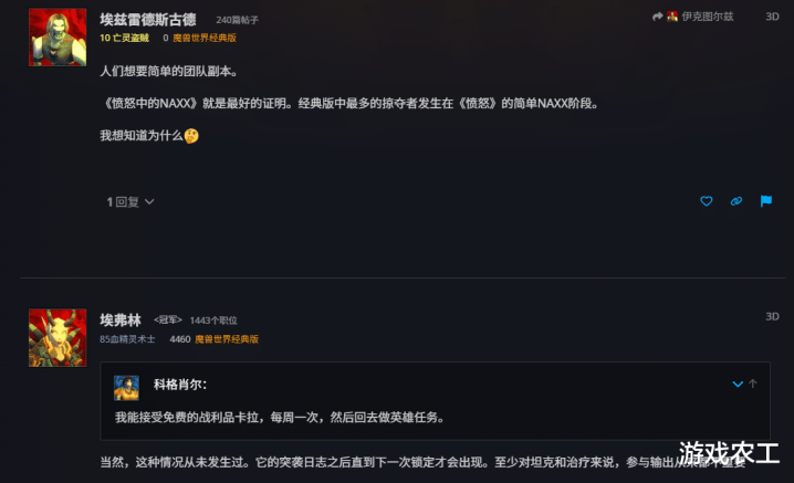 还有人提到,当初暴雪将WLK中的部分团本调整到更难的程度,但是也有人提到这确实没有办法,因为暴雪需要考虑的一个问题就是玩家数量。如果说玩家数量减少了,那么到底是该加面还是加水呢?以时光服为例,虽然大家天天都在说运营方就是一直在加水加面地优化,但是这种优化确实很重要,只有留住玩家才有资格去谈别的事情。