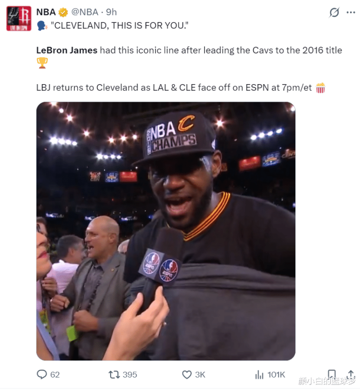 NBA官方也回顾了2016年詹姆斯带队夺冠后的言论:克利夫兰,这是送给你的!