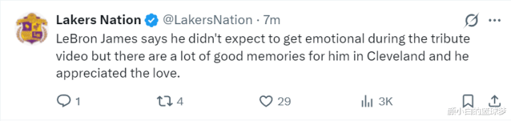 在洗完澡后勒布朗接受了采访,他谈到骑士主场为他播放致敬视频:在观看致敬视频时,我自己也没想到自己会如此动情,但我在克利夫兰有很多美好的回忆,我很感激骑士对他的这份关爱。